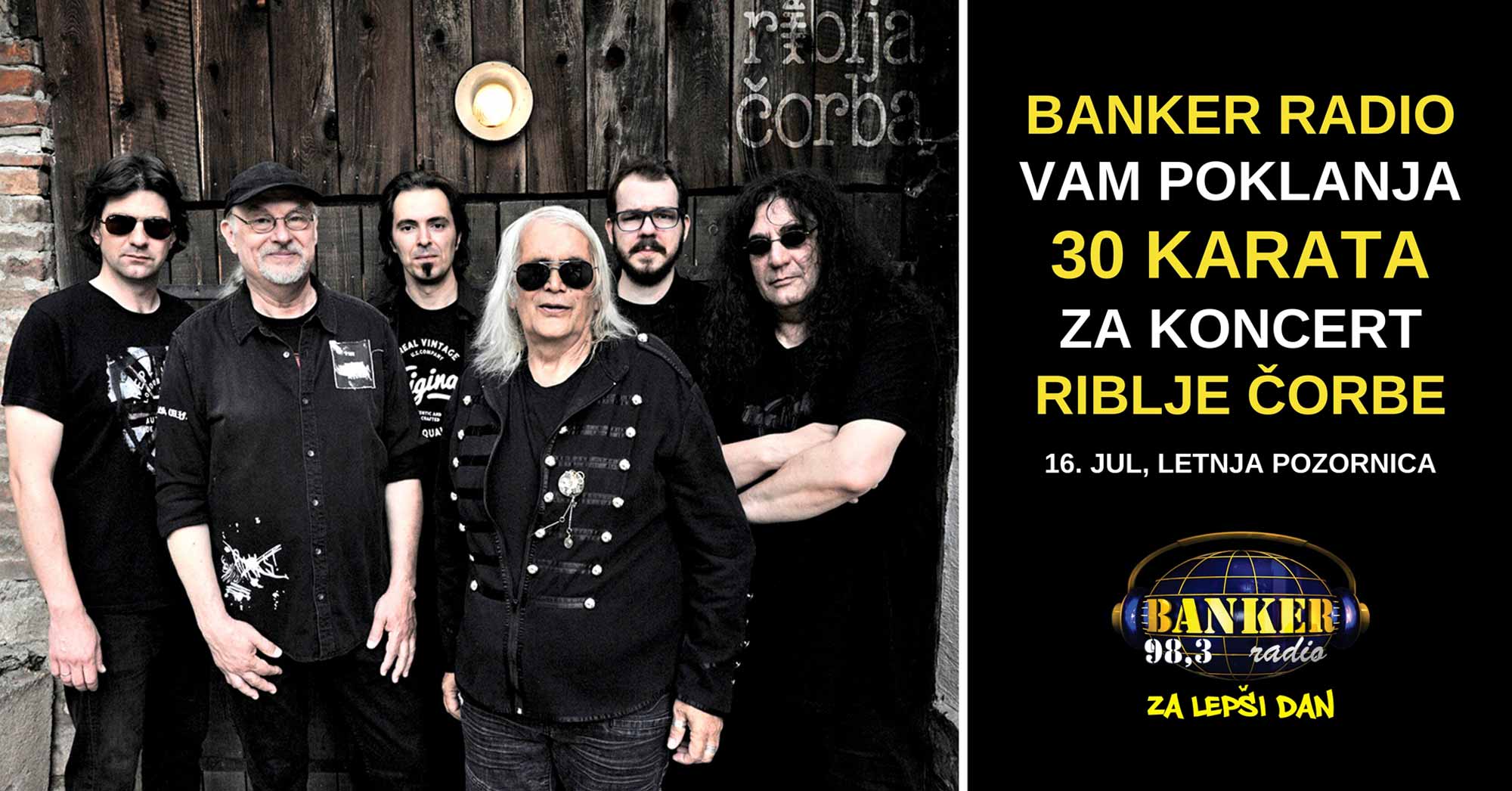 Slušajte program BANKER radija i u danima od 12. do 16. jula (između 7 i 16 sati), kada čujete bilo koju pesmu Riblje Čorbe, pozovite 069/3-983-983. Prvi ko dobije vezu osvaja 2 ulaznice.