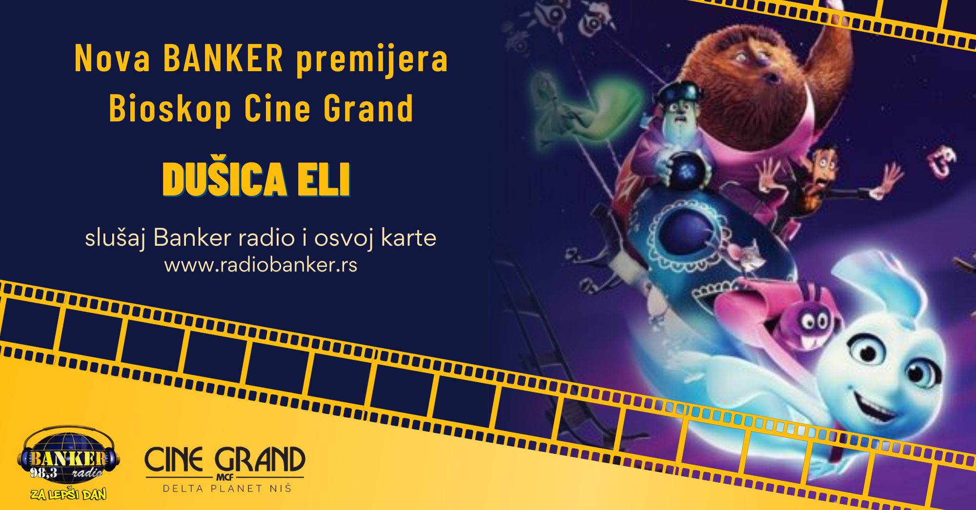 Film “Dušica Eli” gledamo na novoj BANKER premijeri, 6.novembra od 18h. Dođi i ti u BIOSKOP CINE GRAND, u Delta Planetu, da gledamo još jednu animiranu priču. Pažljivo slušaj Naxi BANKER radio svakog radnog dana od 29. oktobra do 5. novembra. Čim čuješ da voditelji uživo pozovu da se prijavite za karte za BANKER premijeru, odmah pozovi 522-229. Ne brini, biće puno prilika da dobiješ vezu jer poklanjamo 100 karata (50 puta po dve).