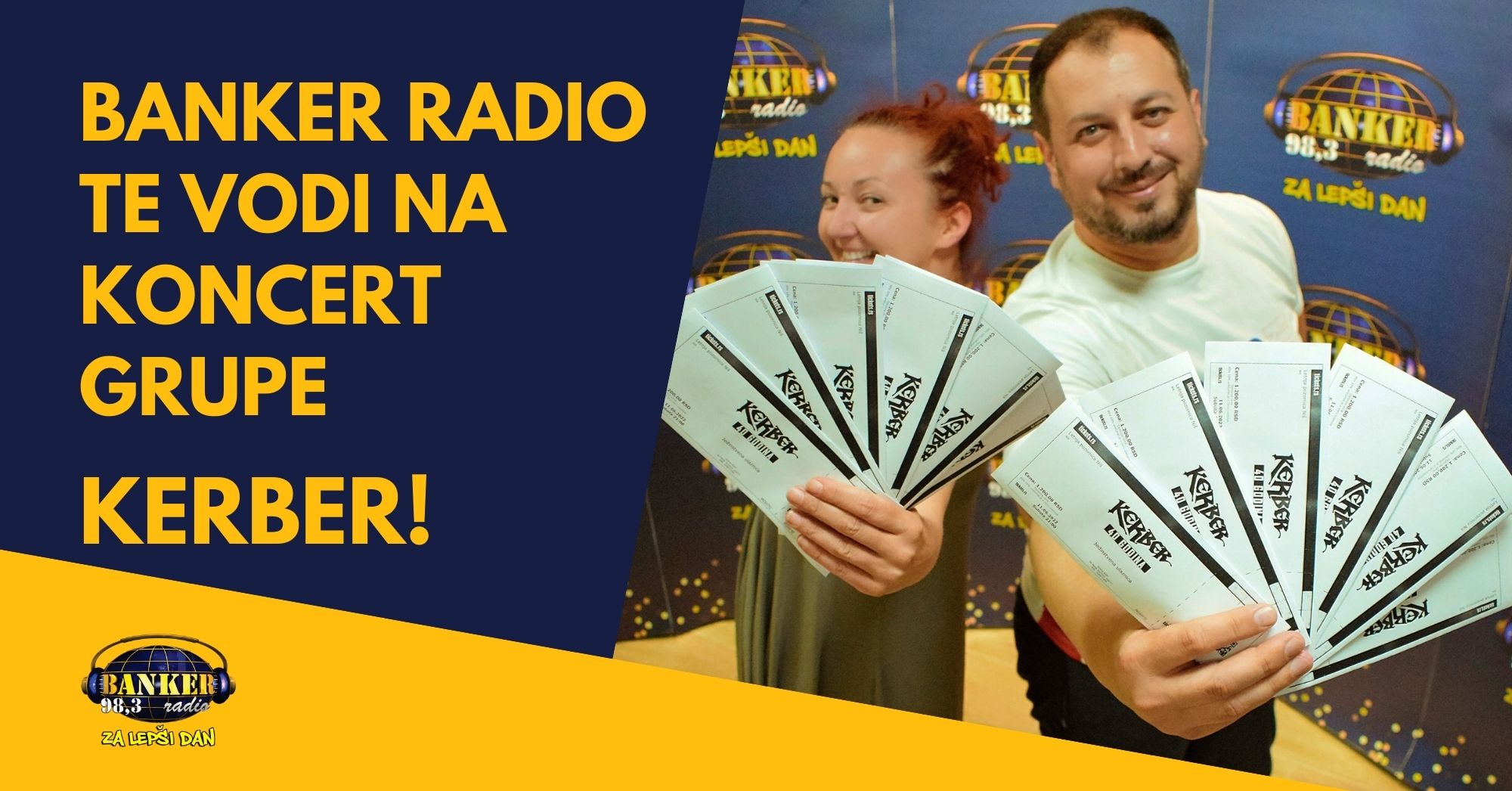 Ukoliko vam slučajno promakne Kerber pesma na radiju, ne brinite, imate šansu da na Fejsbuk strani „BANKER radio 98,3 MHz“ osvojite svoj par karata. Sve što je potrebno da uradite je da tagujete osobu sa kojom planirate da idete na koncert. Objava na kojoj je potrebno da tagujete osobu sa kojom idete na koncert će biti objavljena na našoj FB stranici u ponedeljak 06. juna u podne. Izvlačenje organizujemo u petak 10. juna u podne uz pomoć aplikacije „Comment picker“ i jedna nasumično odabrana osoba će osvojiti 2 karte.