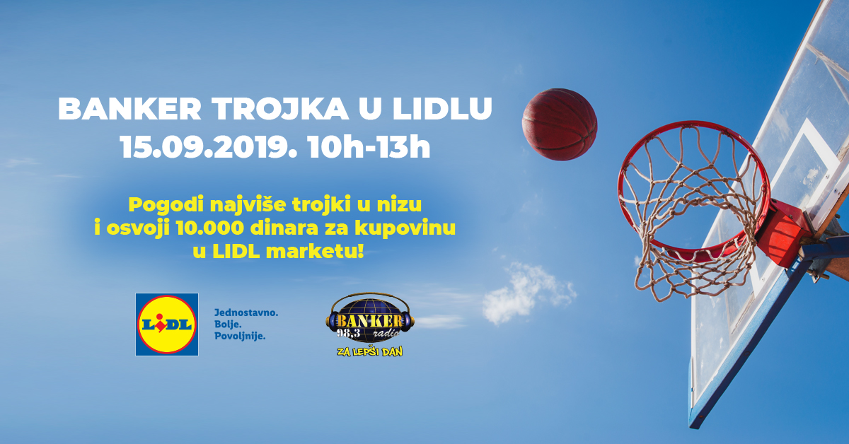 U nedelju, 15. septembra, postavićemo koš na parking LIDL marketa. Tog dana svi učesnici naše igre „Lidlova petorka na Bankeru“ mogu da šutiraju trojke. A ako nisi bio učesnik igre na radiju, nije problem, moći ćeš i ti da šutiraš trojke na parkingu LIDL marketa! Svi vi koji tog dana fiskalnim računom dokažete da ste kupovali u LIDL marketu stičete pravo da šutirate trojke i da osvojite čak 10.000 dinara za kupovinu u LIDL-u!