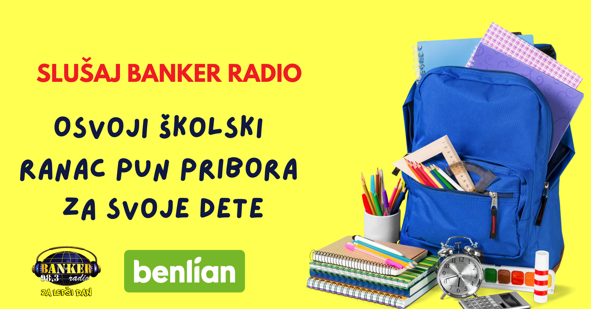 BANKER radio i niška kompanija Benlian Foods poklanjaju vam budžet od 150 evra namenjen za kupovinu ranca i školske opreme za vase školarce.