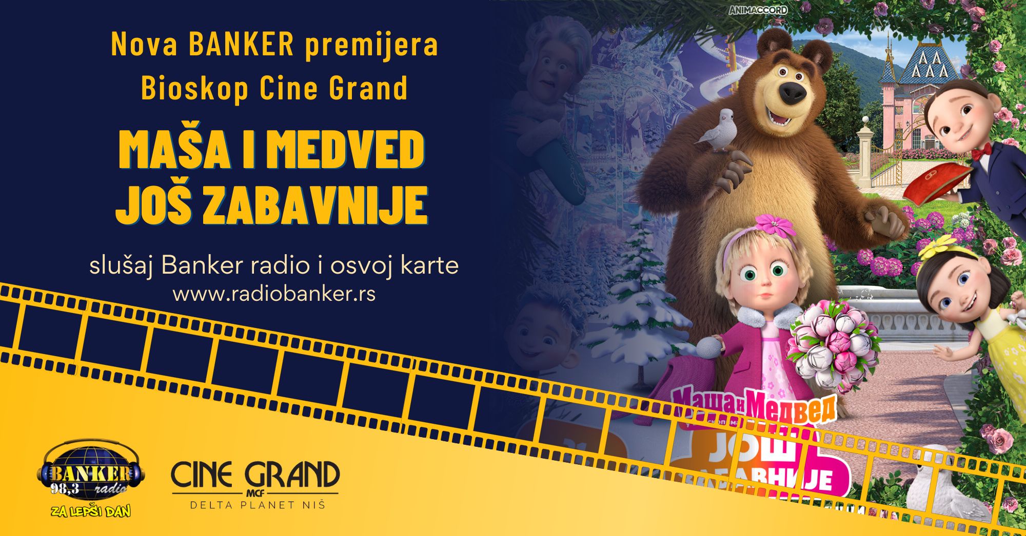 Zadivljujuću, dirljivu i magičnu novogodišnju bajku „Maša i medved: Još zabavnije“ gledamo na novoj BANKER premijeri, 27. decembra od 18h. Dođi i ti u BIOSKOP CINE GRAND, u Delta Planetu, da zajedno pratimo njihove avanture.